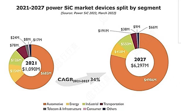 碳化硅(SiC)是第三代半導(dǎo)體材料的核心。相較于前兩代材料,碳化硅具有耐高壓、耐高溫、低損耗等優(yōu)越性能,具有較高的導(dǎo)熱率、熔點等。資料來源:Yole基于碳化硅材料的半導(dǎo)體器件可應(yīng)用于汽車、充電設(shè)備、便攜式電源、通信設(shè)備、機械臂、飛行器等多個工業(yè)領(lǐng)域。碳化硅材料的特性決定了它將會逐步取代傳統(tǒng)硅基,打開巨大的市場空間。根據(jù)Yole數(shù)據(jù),受新能源汽車行業(yè)龐大的需求驅(qū)動,以及光伏風(fēng)電和充電樁等領(lǐng)域?qū)τ谛屎凸囊筇嵘挠绊?,預(yù)計到2027年碳化硅功率器件的市場規(guī)模將達到62.97億美元,2021-2027年的復(fù)合增速約為34%。2021年-2027年全球碳化硅功率器件各細分市場規(guī)